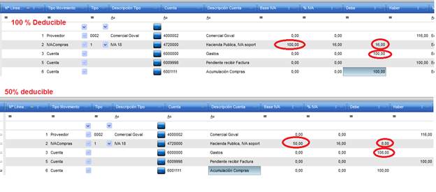 Paso un ejemplo de cuál es la diferencia entre un IVA definido con 100% Deducible y un Iva en el que el iva no deducible, se incremente el coste.
