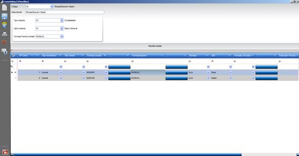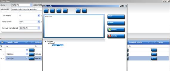 •Fórmula Cuenta. Cuenta contable asociada al Tipo de Movimiento. Puede ser preseleccionada del plan de cuentas, o manual, es decir, se define en el momento de registrar el asiento. En este caso, pulsaremos el botón para asignar la fórmula.